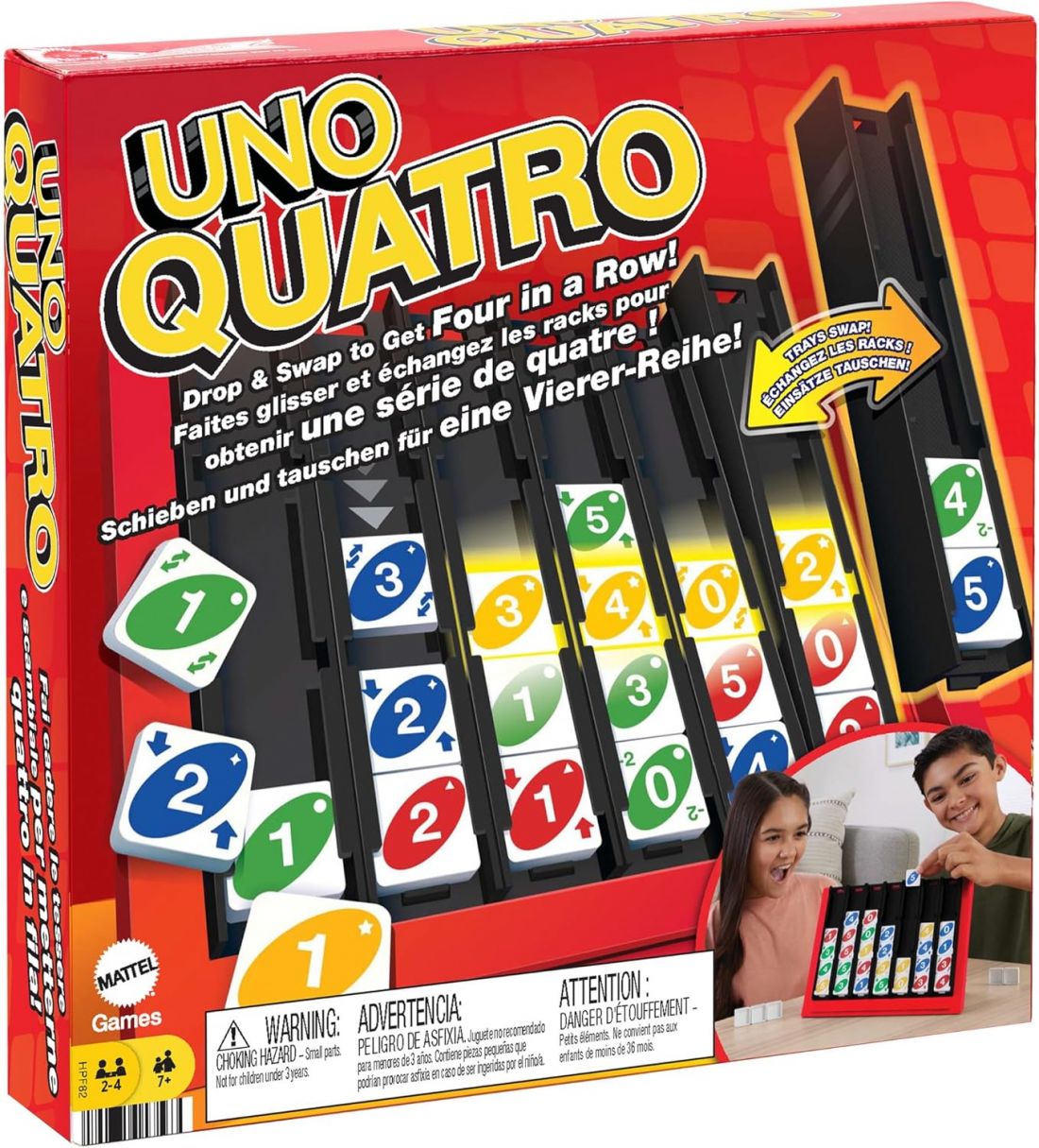 Uno Quatro combina la estrategia de hacer coincidir el color o el número con el desafío de conseguir cuatro en raya y, además, contiene fichas especiales que te permiten mover otras fichas y las bandejas para poner el juego patas arriba con un solo movimiento.